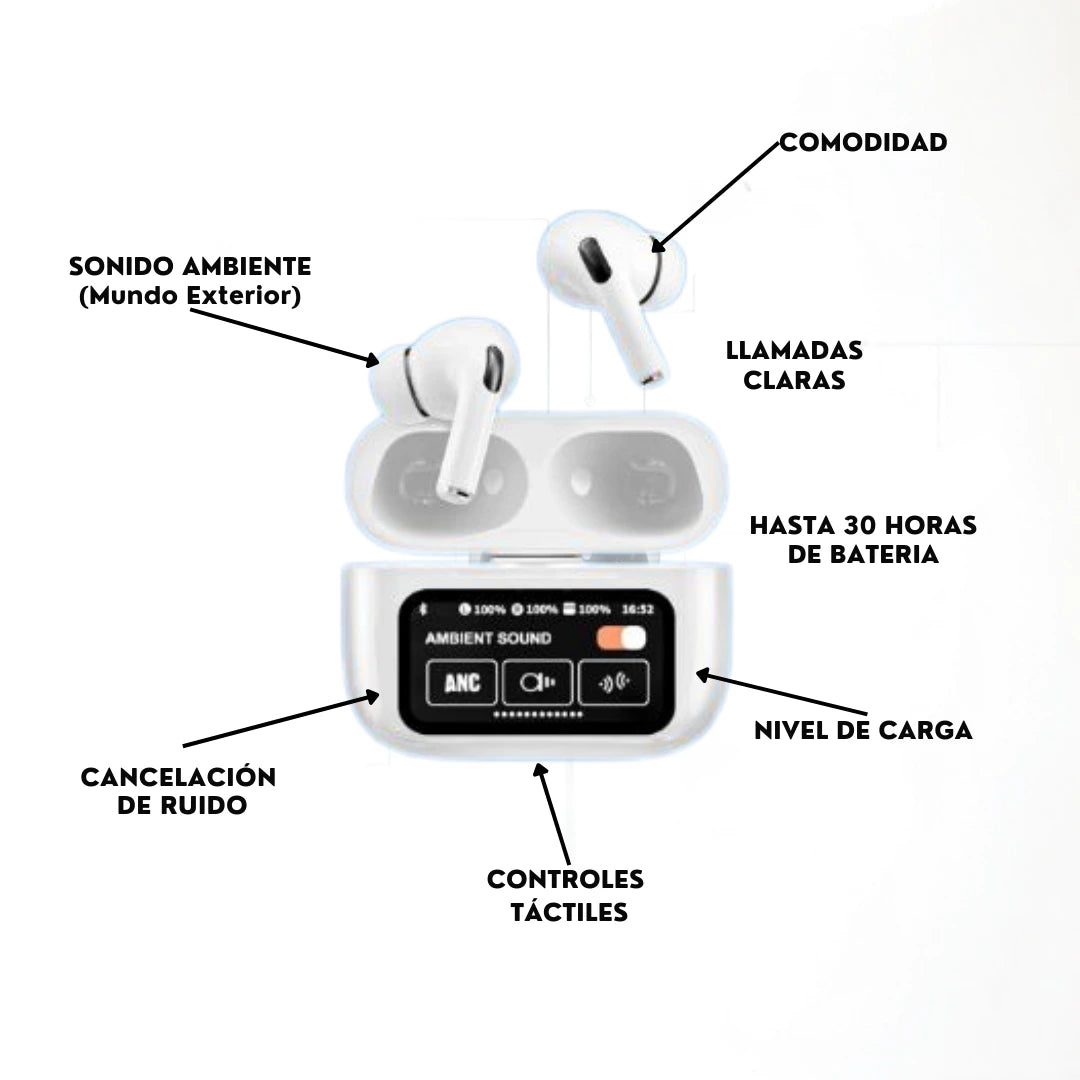 Los NoizeFree Pods® traen una pantalla táctil intuitiva, que te permite ver todas las funciones directamente.